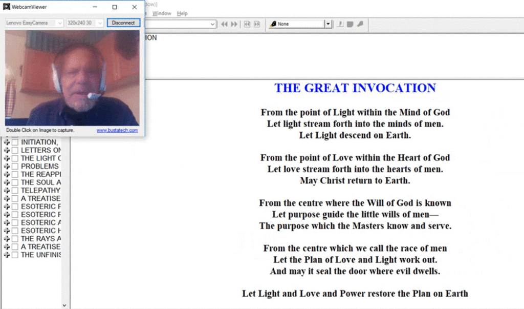 | I’d actually like to begin with the great invocation and then show you the chart for the beginning of this endeavor. So let’s align with this great word of power. We will align with the forces of light, of love, and of power, spiritual will with humanity as a whole. | Thực tế, tôi muốn bắt đầu với Đại Khấn Nguyện và sau đó cho bạn thấy biểu đồ cho sự khởi đầu của nỗ lực này. Vì vậy, hãy chỉnh hợp với linh từ quyền năng này. Chúng ta sẽ chỉnh hợp với các mãnh lực của ánh sáng, tình thương, và quyền năng, ý chí thiêng liêng với nhân loại nói chung. |