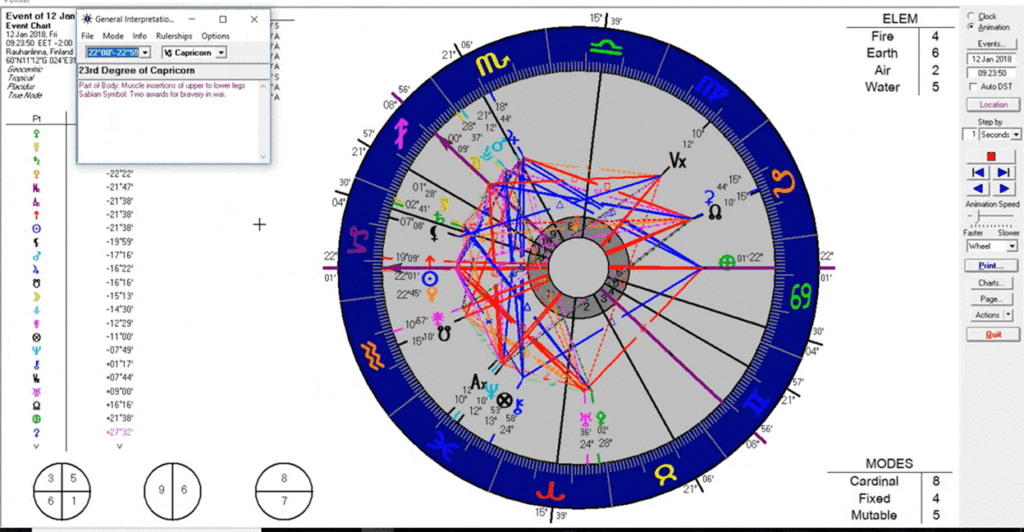 | I’ve got Capricorn rising. It’s about sunrise here. And, of course, the Sabian symbols are nice to us. The moon has moved into Sagittarius which I think is, it’s better to begin with the moon in Sagittarius than with Scorpio. It gives that kind of forward looking progression and enthusiasm which is useful. All of these degrees 22 plus for the Sun and Venus have a rather nice symbol here two awards for bravery in war. | Tôi có dấu hiệu Sư Tử mọc, lúc này gần đến lúc mặt trời mọc ở đây. Và dĩ nhiên, các biểu tượng Sabian rất tốt với chúng ta. Mặt trăng đã chuyển vào Nhân Mã, điều này tôi nghĩ là—sẽ tốt hơn nếu bắt đầu với mặt trăng ở Nhân Mã hơn là ở Hổ Cáp. Nó mang lại cảm giác hướng về phía trước, tiến triển và đầy nhiệt huyết, điều đó thật hữu ích. Tất cả các độ số này, từ 22 độ trở lên đối với Mặt trời và Kim tinh, đều có một biểu tượng khá đẹp: hai phần thưởng cho lòng dũng cảm trong chiến tranh. |