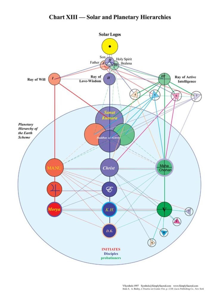 | I guess every member of the spiritual hierarchy is a white magician and we aspirants and disciples, we are included within this circle of hierarchy. Maybe I can show that to you. [see below] Within this blue circle we are included here. The grades of initiates, less than Master, the various grades of disciples and the people on the probationary path. All are included within the circle of hierarchy. This is a marvelous diagram as you probably know. It’s the Tibetan’s diagram and it’s filled in the significant colors by Keith Bailey for the AUM group long ago. [Note, the image from the video is replaced with a similar recreation of Chart XIII, Solar and Planetary Hierarchies, by Vicktorya Stone, for better reproduction.] | Tôi đoán rằng mỗi thành viên của Thánh đoàn tinh thần là một nhà huyền thuật chánh đạo, và chúng ta, những người chí nguyện và đệ tử, cũng được bao gồm trong vòng tròn của Thánh đoàn này. Có lẽ tôi có thể chỉ cho bạn thấy điều đó. [xem bên dưới] Trong vòng tròn màu xanh này, chúng ta được bao gồm ở đây. Các cấp bậc của điểm đạo đồ, dưới mức Chân sư, các cấp bậc khác nhau của đệ tử và những người trên con đường dự bị. Tất cả đều được bao gồm trong vòng tròn của Thánh đoàn. Đây là một biểu đồ tuyệt vời như bạn có thể biết. Đây là biểu đồ của Chân sư Tây Tạng và nó đã được Keith Bailey tô màu quan trọng cho nhóm AUM từ lâu. [Lưu ý, hình ảnh từ video được thay thế bằng một tái tạo tương tự của Biểu đồ XIII, Hệ Thống Huyền Giai Thái Dương và Hành Tinh, bởi Vicktorya Stone, để tái tạo tốt hơn.] |