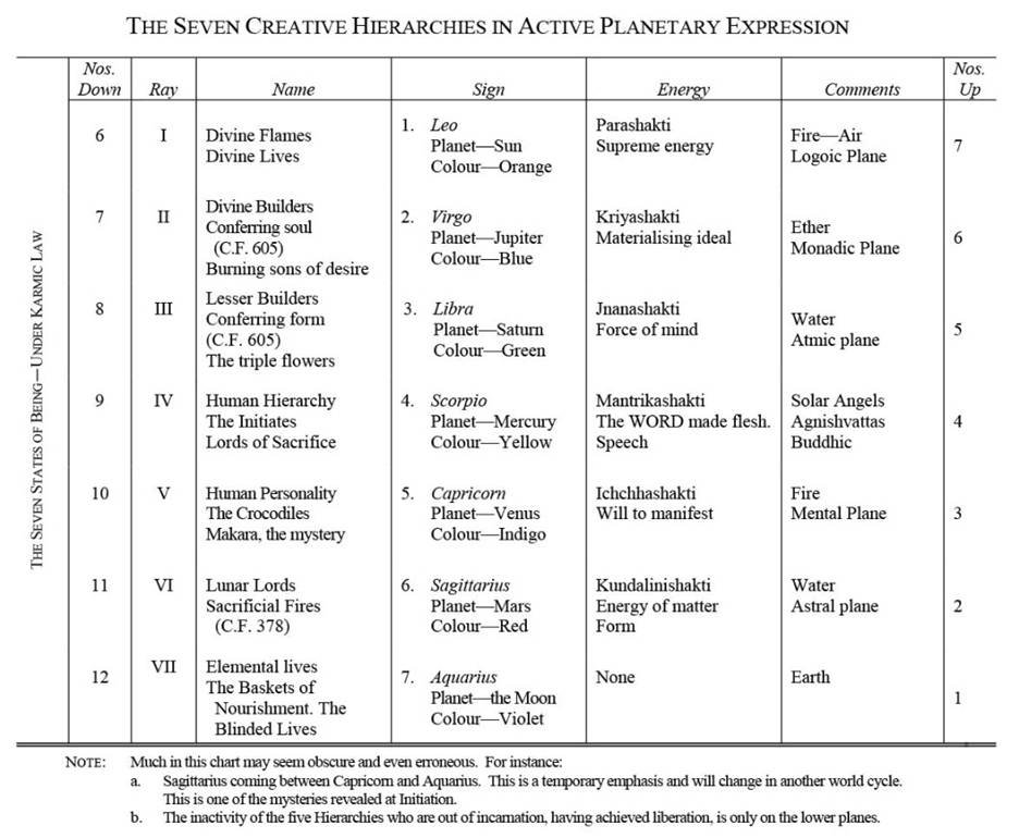 | 2. The Hierarchy of Rays—certain groupings of the seven rays in relation to our planet. | 2. Huyền Giai các Cung — một số nhóm nhất định của bảy cung liên quan đến hành tinh của chúng ta. |